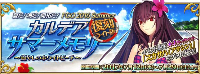 夏だ! 海だ! 開拓だ! FGO 16 Summer (〜01) 最終更新:16年09月28日 0135FGO 16 Summer カルデアサマーメモリー ~癒やしのホワイトビーチ~ ライト版」! イベント開催期間 17年7月12日(水) 1800~7月29日(土) 2359まで イベント概要 期間限定イベント「復刻夏だ!FGO攻略「復刻夏だ! 海だ! 開拓だ! FGO 16 Summer カルデアサマーメモリー ~癒やしのホワイトビーチ~ ライト版」チャレンジクエスト出現エネミー、ドロップアイテム攻略まとめ続きを